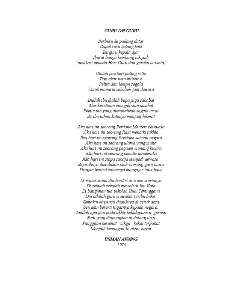 Guru Oh Guru A Poem by Usman Awang 1979 As a special. Published on March 2020 Categories. Unduh sebagai DOC atau baca online dari Scribd.